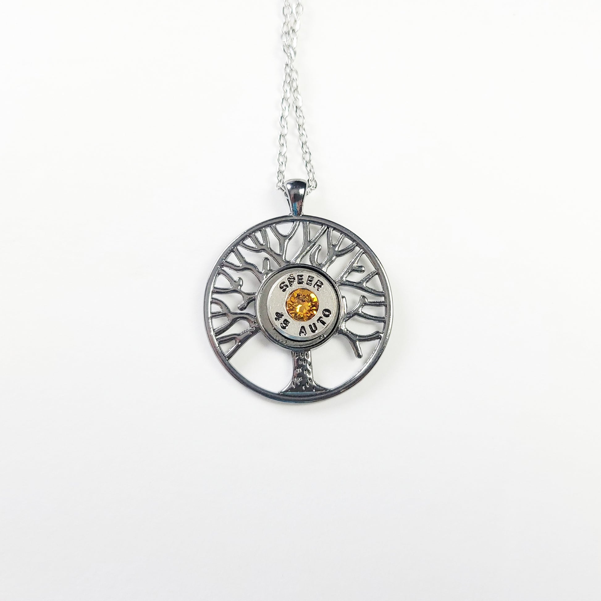Elevate your style with the Haunted Tree of Life Bullet Necklace, featuring a striking gunmetal gray finish. This sophisticated piece centers on a genuine bullet casing, adorned with a shimmering topaz crystal, blending strength with elegance. Its intricate Tree of Life design symbolizes growth and resilience, making it a meaningful accessory for those who appreciate unique craftsmanship and bold beauty.\
