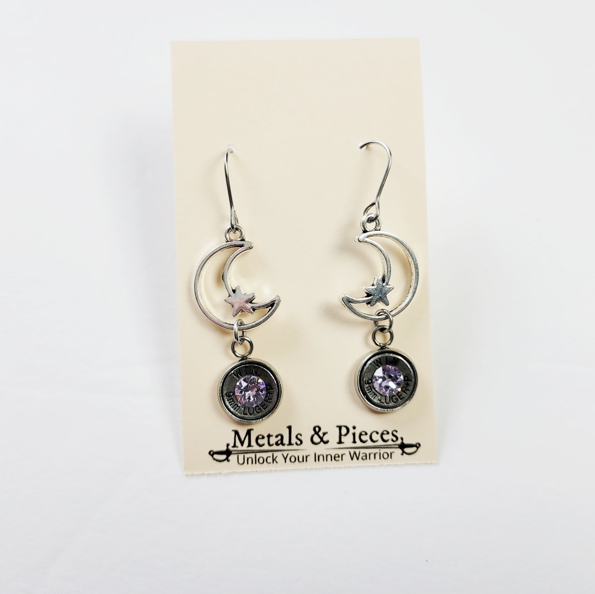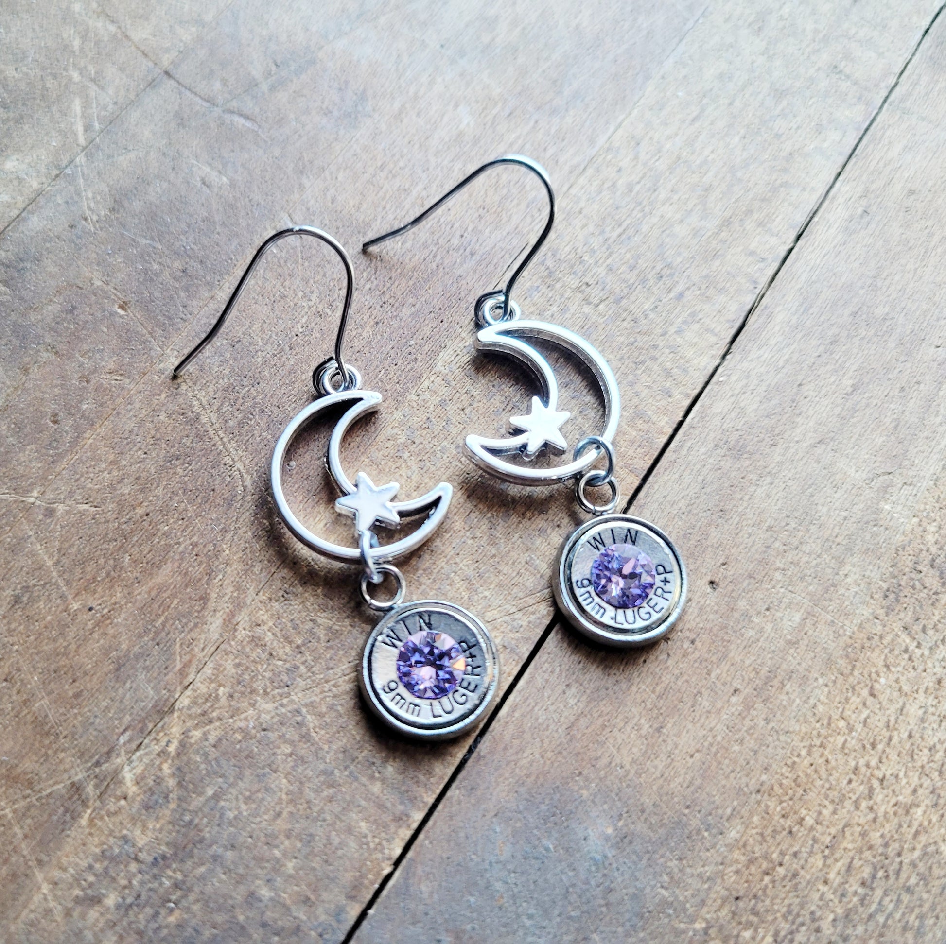 Born under the stars and forged with fire, the Lunar Rounds Earrings are a perfect balance of soft power and celestial mystery. These dreamy dangles feature crescent moons paired with tiny stars, finished with real 9mm bullet casings set with sparkling lavender crystals — your February birthstone in full cosmic glow.