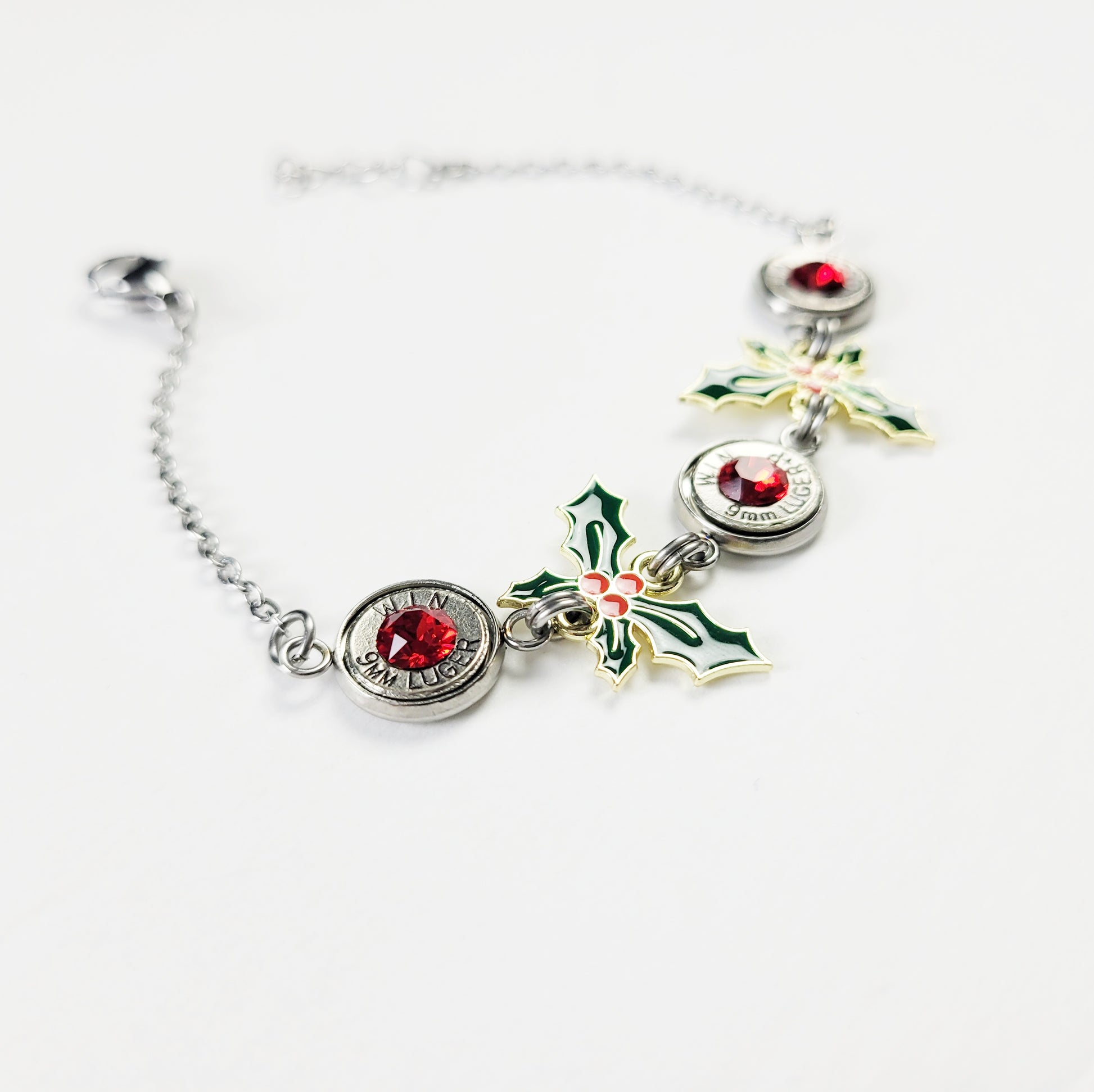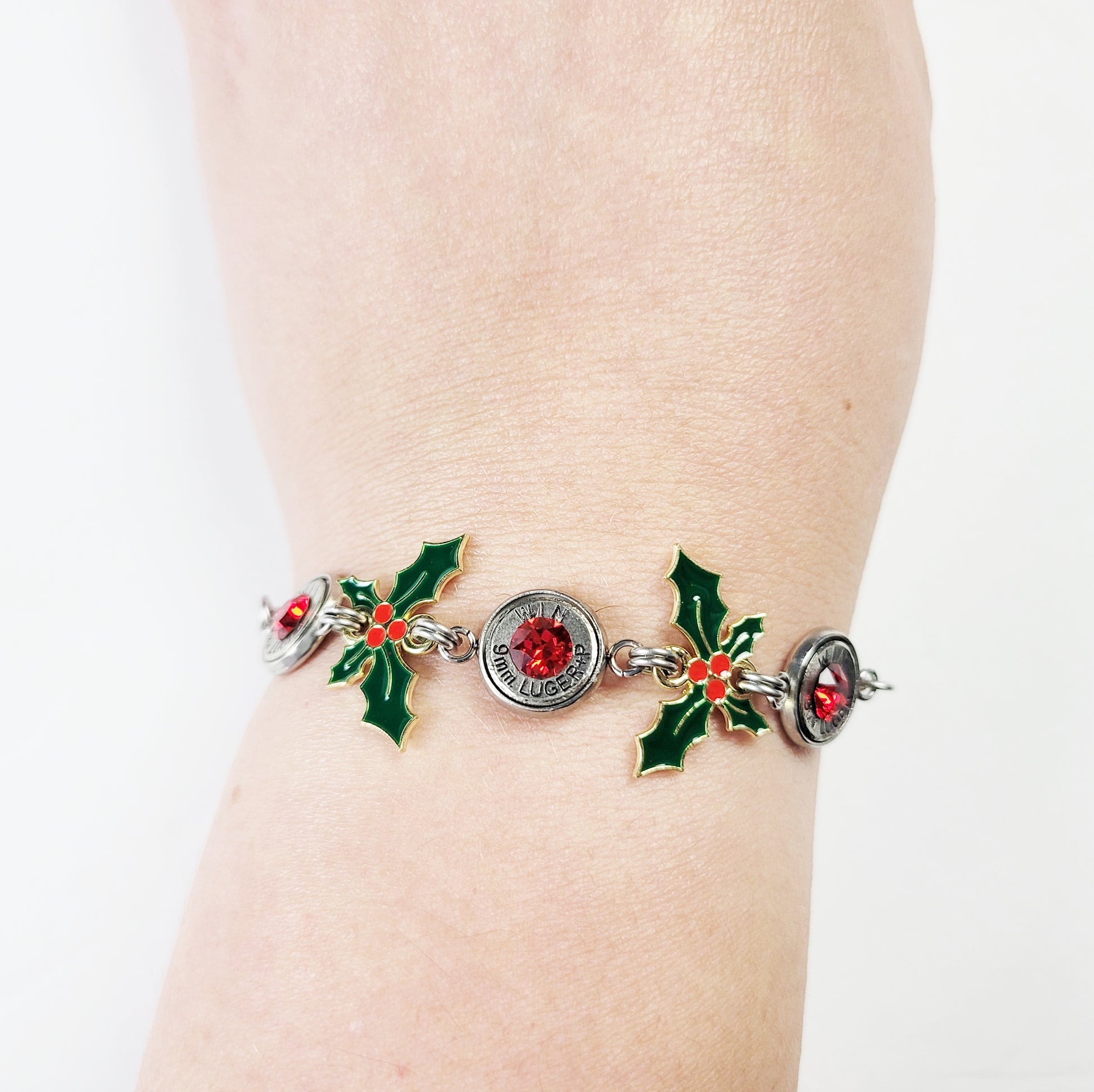 The Holly Bullet Bracelet blends festive glam with fierce energy. Each bracelet features real bullet casings—no plastic here—decked out with deep red crystals and glossy enamel holly sprigs.