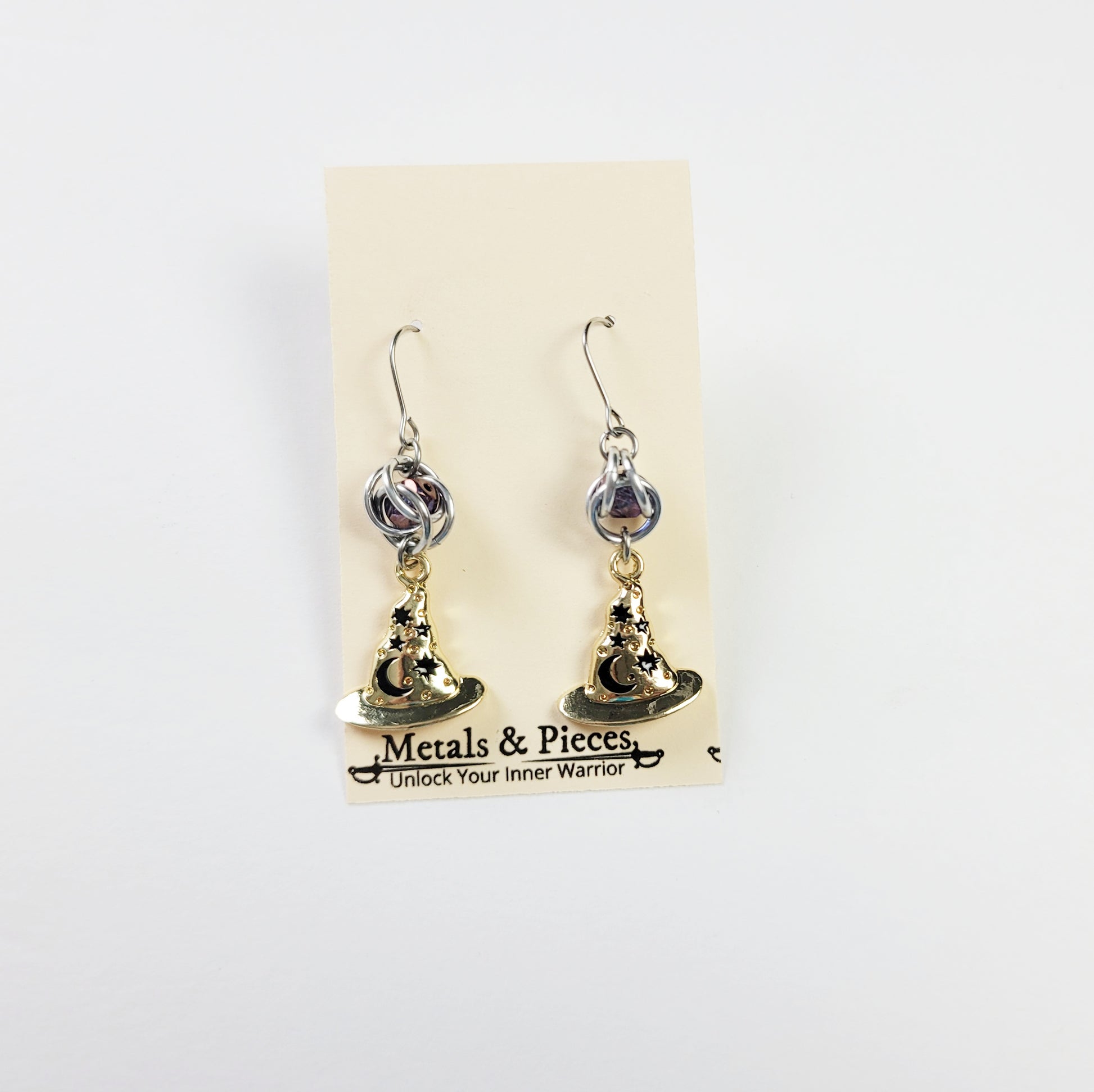 Elevate your style with these sophisticated Magical Witch Earrings. Featuring gold-toned witch hats adorned with delicate moons and stars, they exude an enchanting charm. Each hat dangles gracefully below a light purple bead with a subtle golden sheen, captured within intricate chainmail for a refined finish. Perfect for adding a touch of mystical elegance to any outfit.