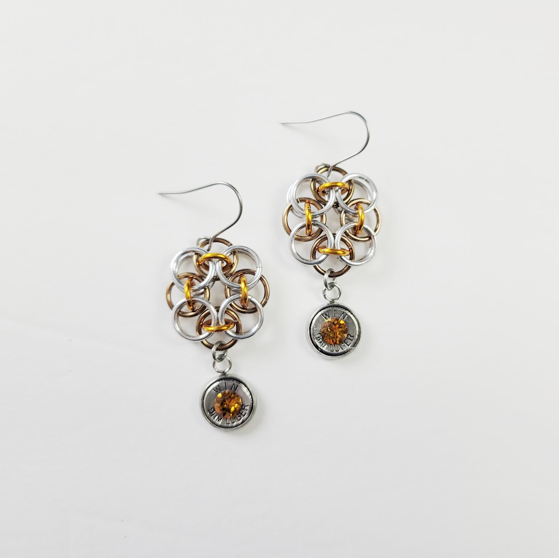 Each pair features handwoven aluminum chainmail in rich autumn tones—like golden leaves and grandma’s pie crust—with a real 9mm bullet casing hanging below, topped with a fiery topaz-colored crystal (aka November’s birthstone).